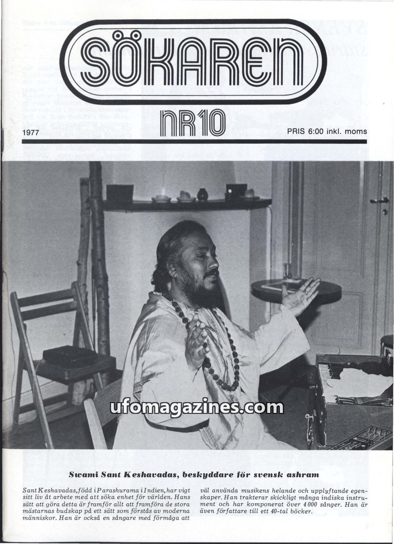 This issue of Sökaren magazine from 1977 focuses on spirituality and alternative lifestyles. It features Swami Sant Keshavadas, a guru promoting Eastern wisdom for modern people, a