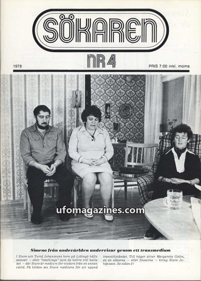 This issue of Sökaren magazine from 1978 delves into spiritual and holistic themes. A central piece details a session with a medium named Sture Johansson, who channels entities fro