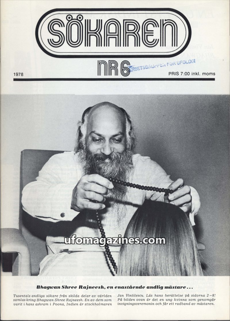 This issue of Sökaren focuses on Bhagwan Shree Rajneesh, detailing his ashram in Poona, India, and his teachings on meditation and spiritual growth. It also explores theories of re
