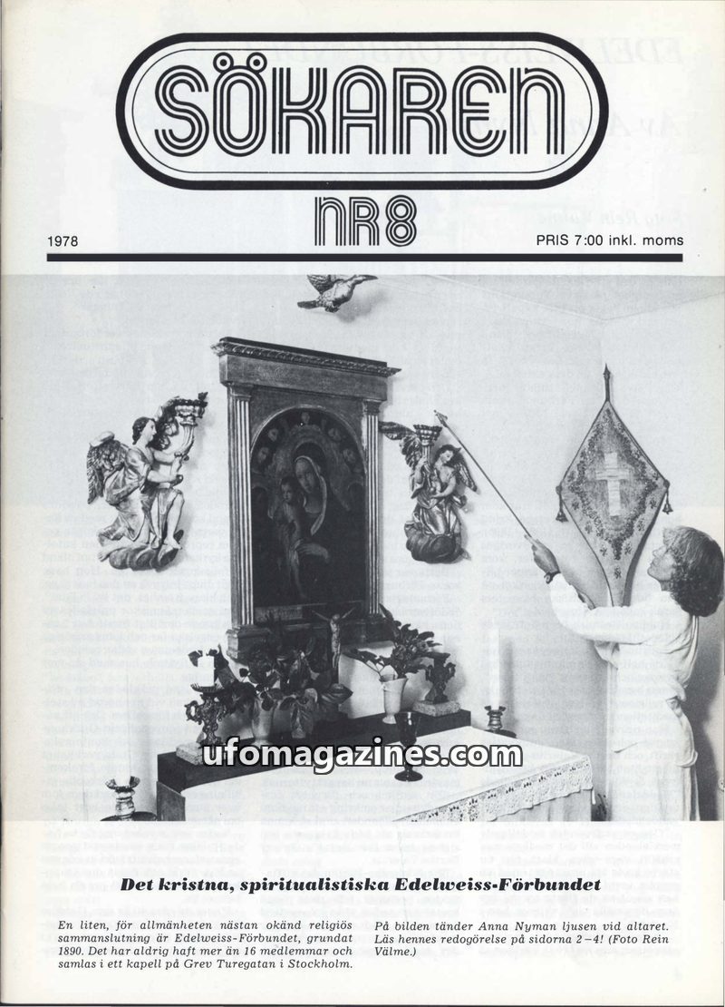 This issue of Sökaren (NR8, 1978) delves into the spiritualist Edelweiss-Förbundet, founded in 1890 and still active in Stockholm. It features an interview with parapsychologist Pr