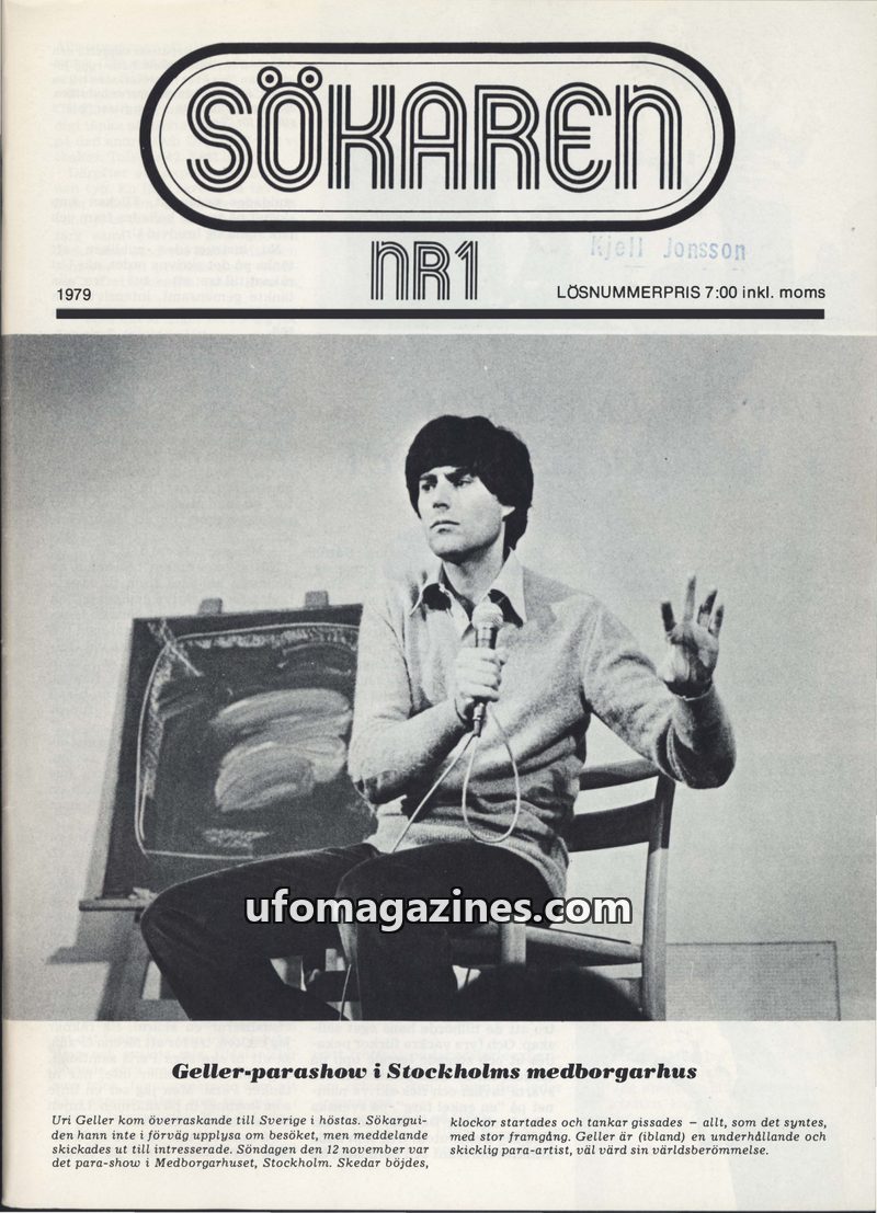 This issue of Sökaren magazine from 1979 covers Uri Geller's para-show in Stockholm, detailing his telepathic demonstrations and claims. It also features an extensive report on Pau