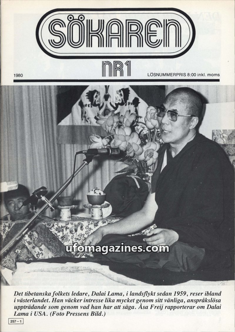 This issue of Sökaren magazine from 1980 focuses on the Dalai Lama, describing his travels in the West and his message of peace and understanding. It also delves into the history a