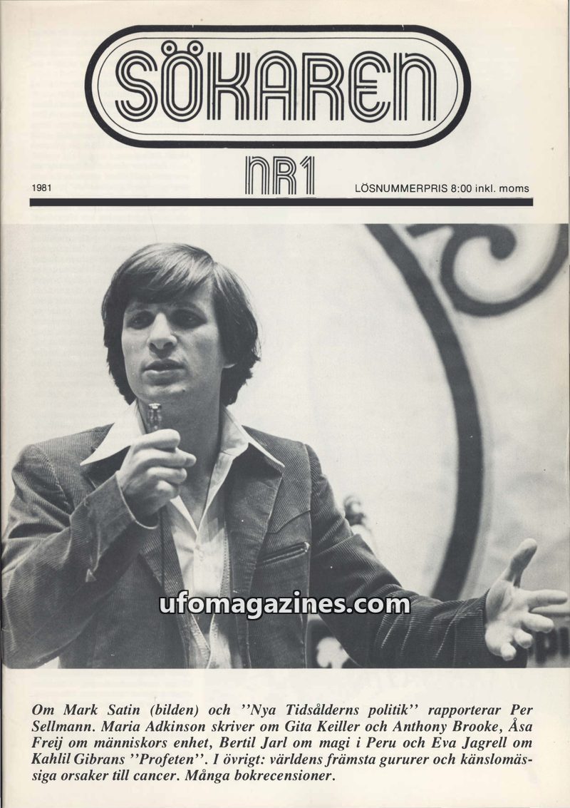 This issue of "Sökaren" (NR1, 1981) delves into "New Age Politics" with a report on Mark Satin and his book. It also features articles on human unity, magic in Peru, Kahlil Gibran'