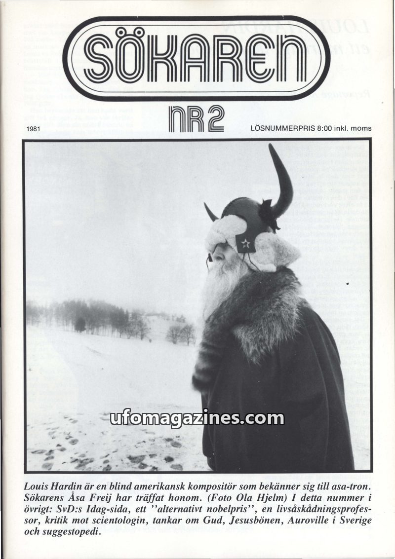 This issue of Sökaren magazine, NR2 from 1981, features an in-depth look at Louis Hardin, also known as Moondog, a blind American composer who adheres to the Asatru faith. The maga