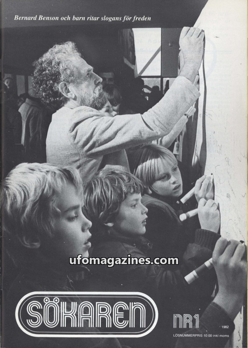 This issue of SÖKAREN (NR1, 1982) focuses on peace and disarmament, prominently featuring Bernard Benson and his book 'Fredsboken'. Benson advocates for global peace through disarm
