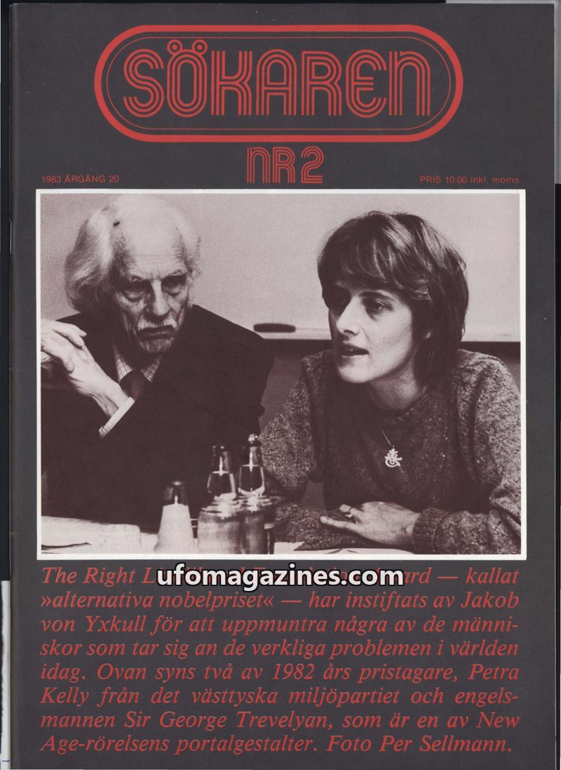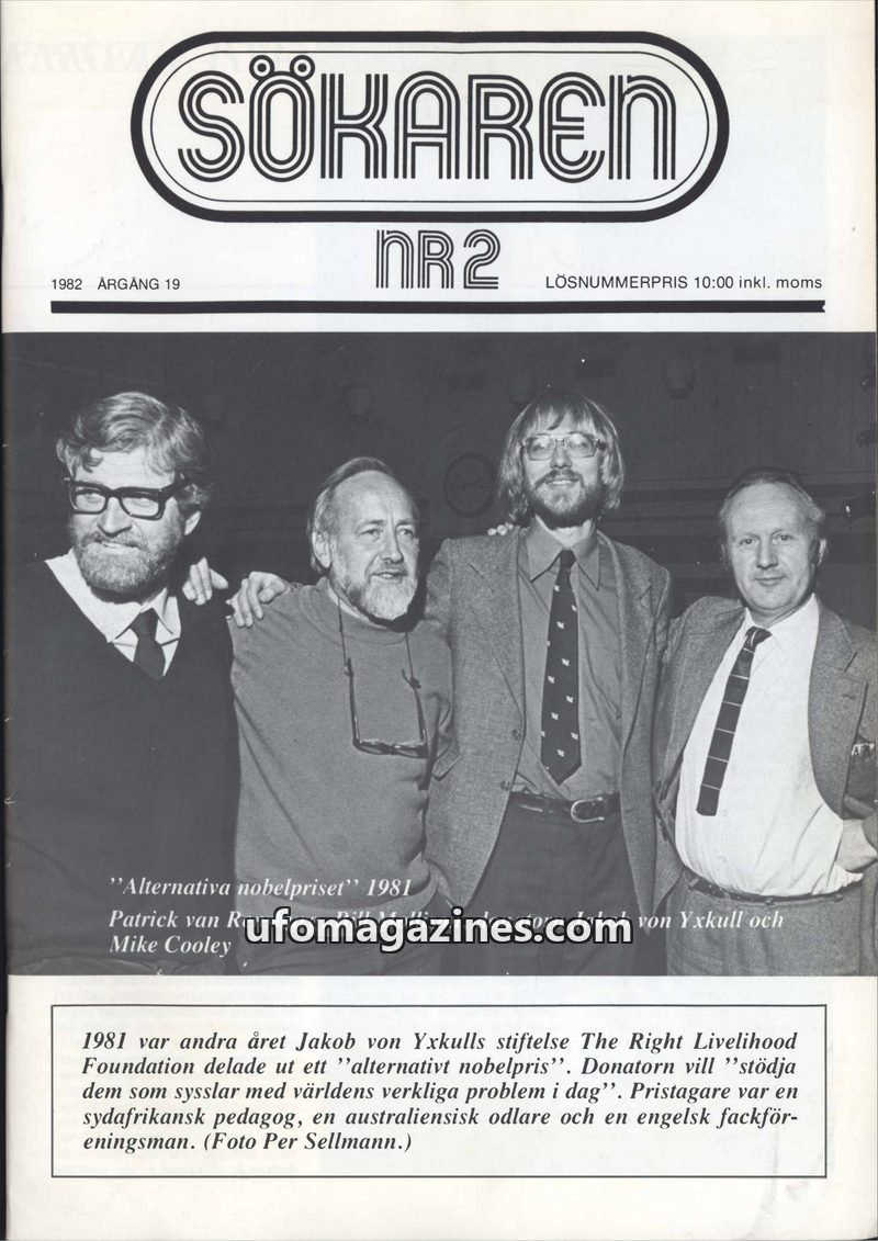This issue of Sökaren magazine highlights the 1982 Right Livelihood Foundation Award, also known as the 'alternative Nobel Prize,' established by Jakob von Yxkull. The award recogn