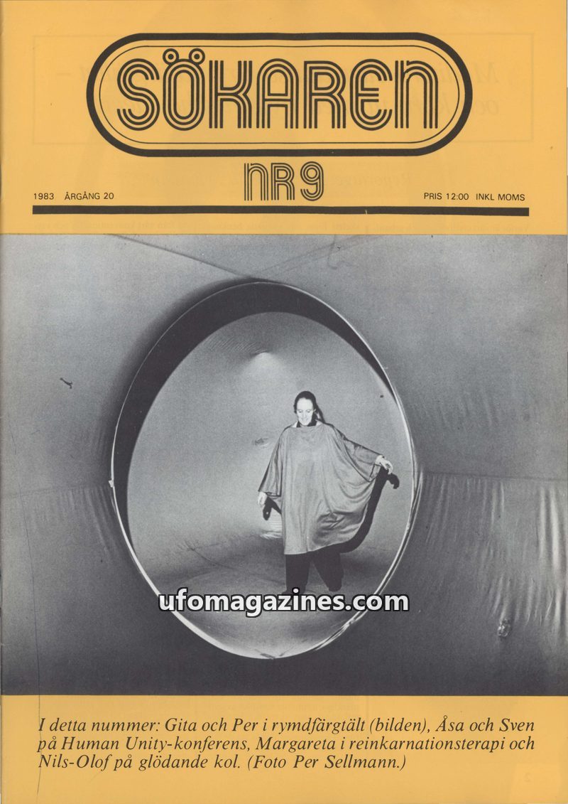 This issue of Sökaren magazine, NR9 from 1983, focuses on themes of human unity, New Age consciousness, and holistic health. It features an article on 'Spaceplace-Colourscape' tent