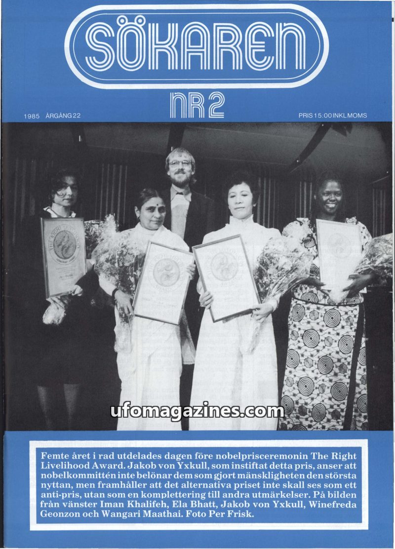 The 1985 issue of Sökaren magazine highlights the fifth annual presentation of The Right Livelihood Award, often called the 'alternative Nobel Prize'. The award, founded by Jakob v