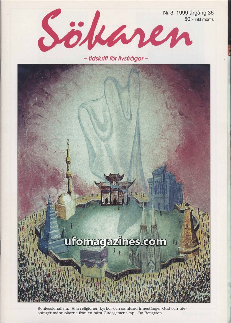 This issue of Sökaren magazine delves into various spiritual and philosophical topics. Bo Bengtson's art explores the concept of God being enclosed by religions. Kenneth Ring discu