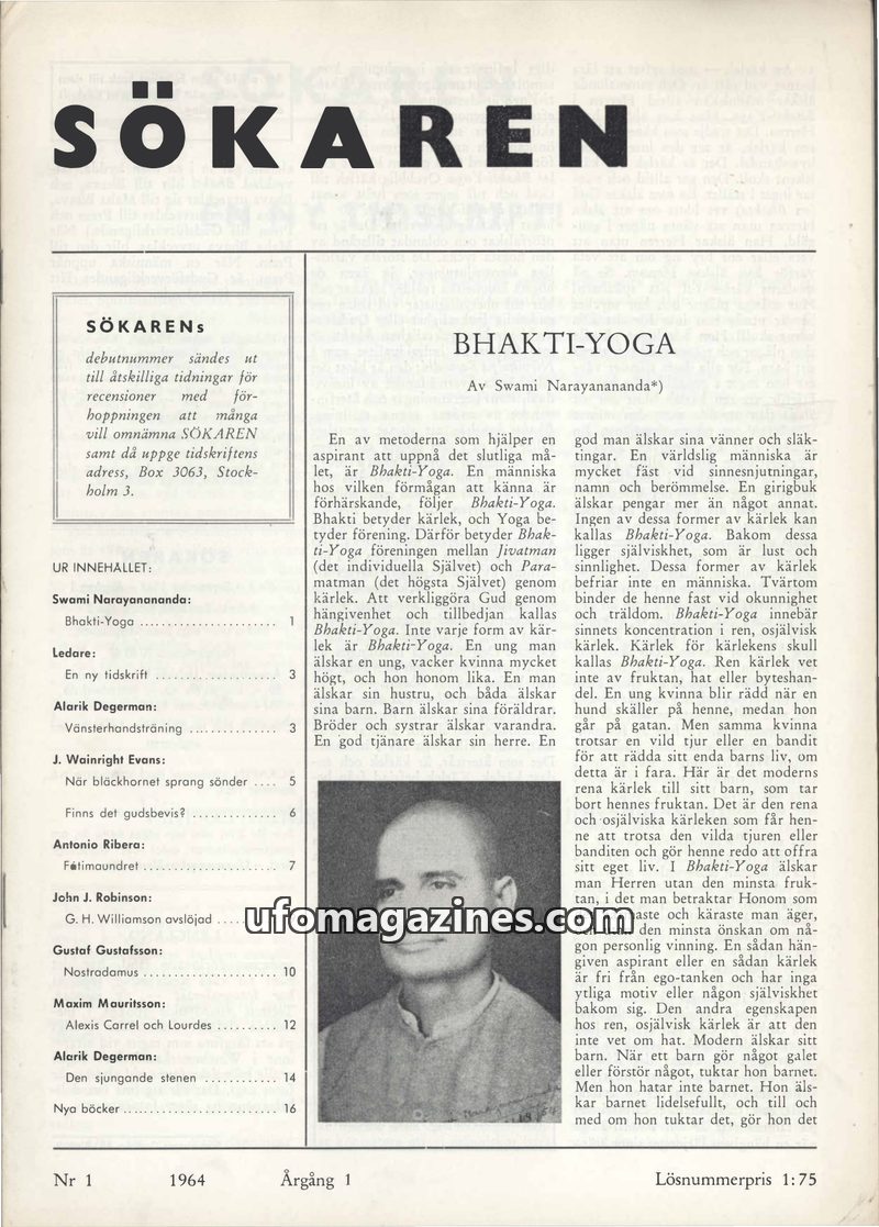 The inaugural issue of Sökaren magazine (September 1964) introduces Bhakti-Yoga as a path to spiritual union through selfless love. It delves into the potential of left-hand traini