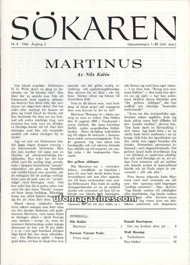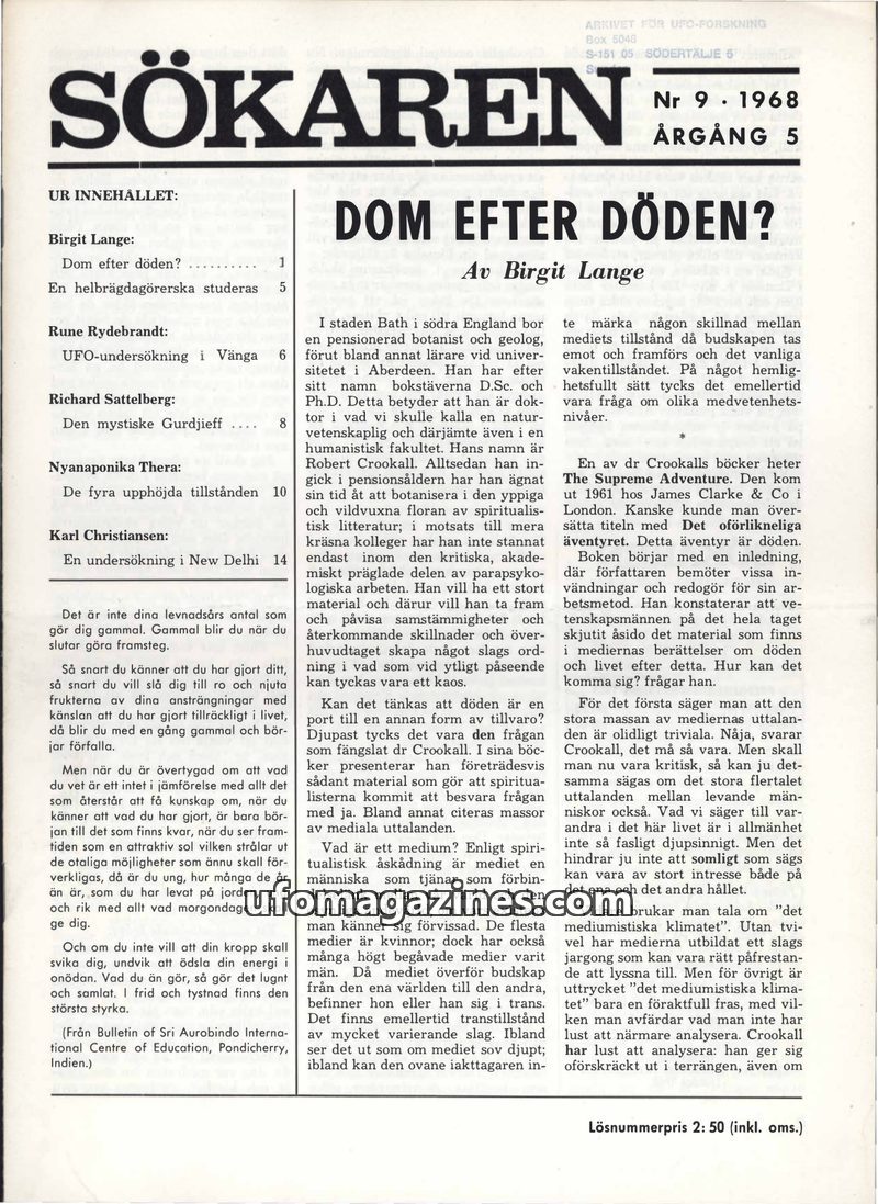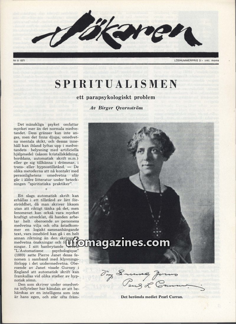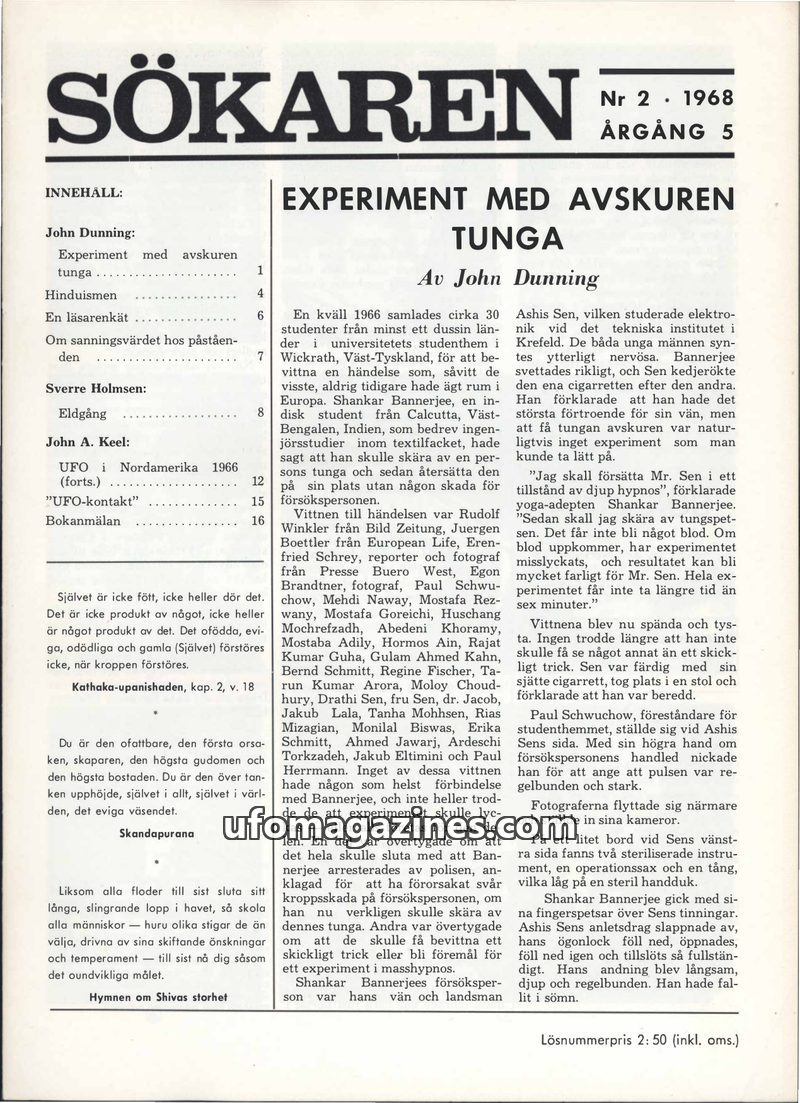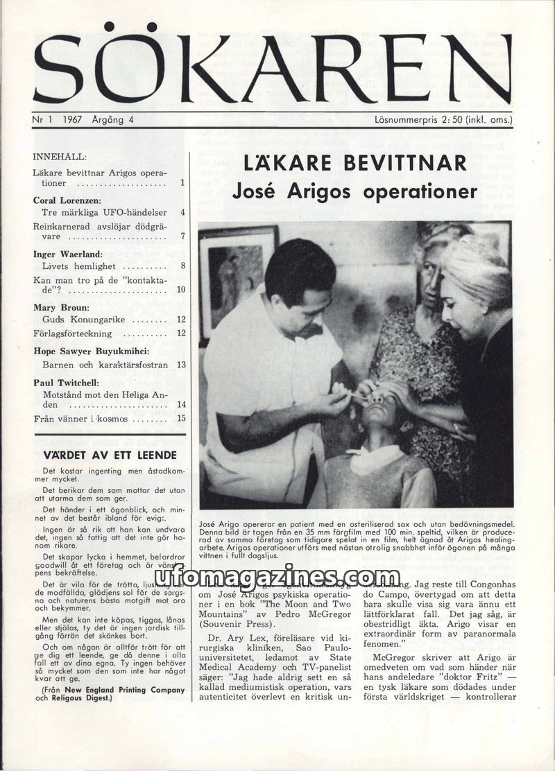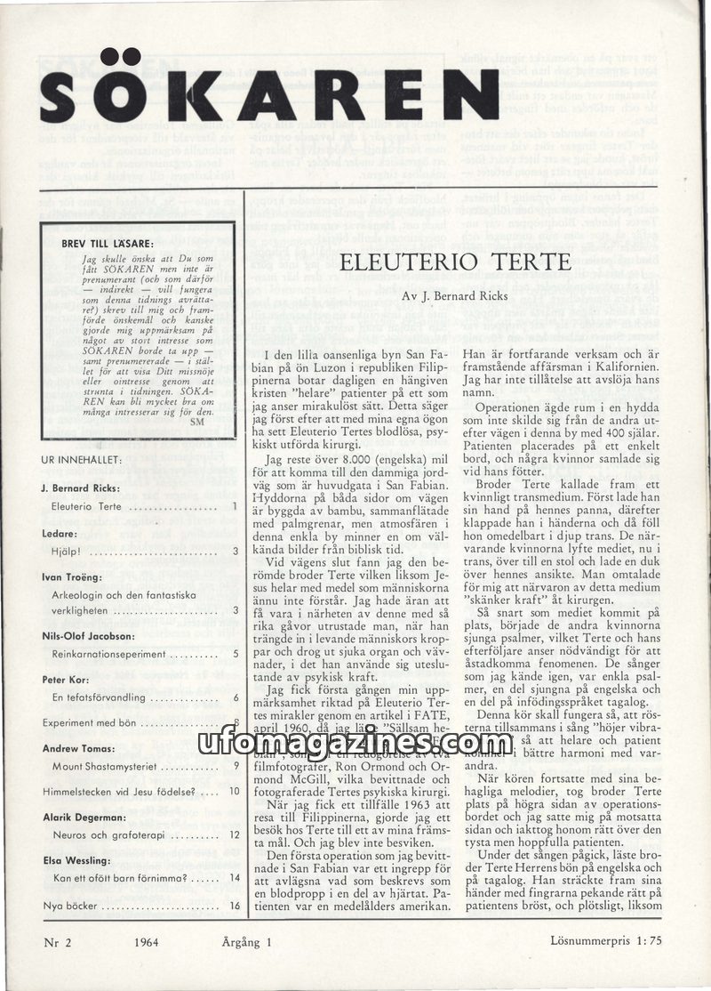 This issue of Sökaren magazine delves into extraordinary phenomena. J. Bernard Ricks details the bloodless psychic surgeries of Eleuterio Terte in the Philippines, removing organs
