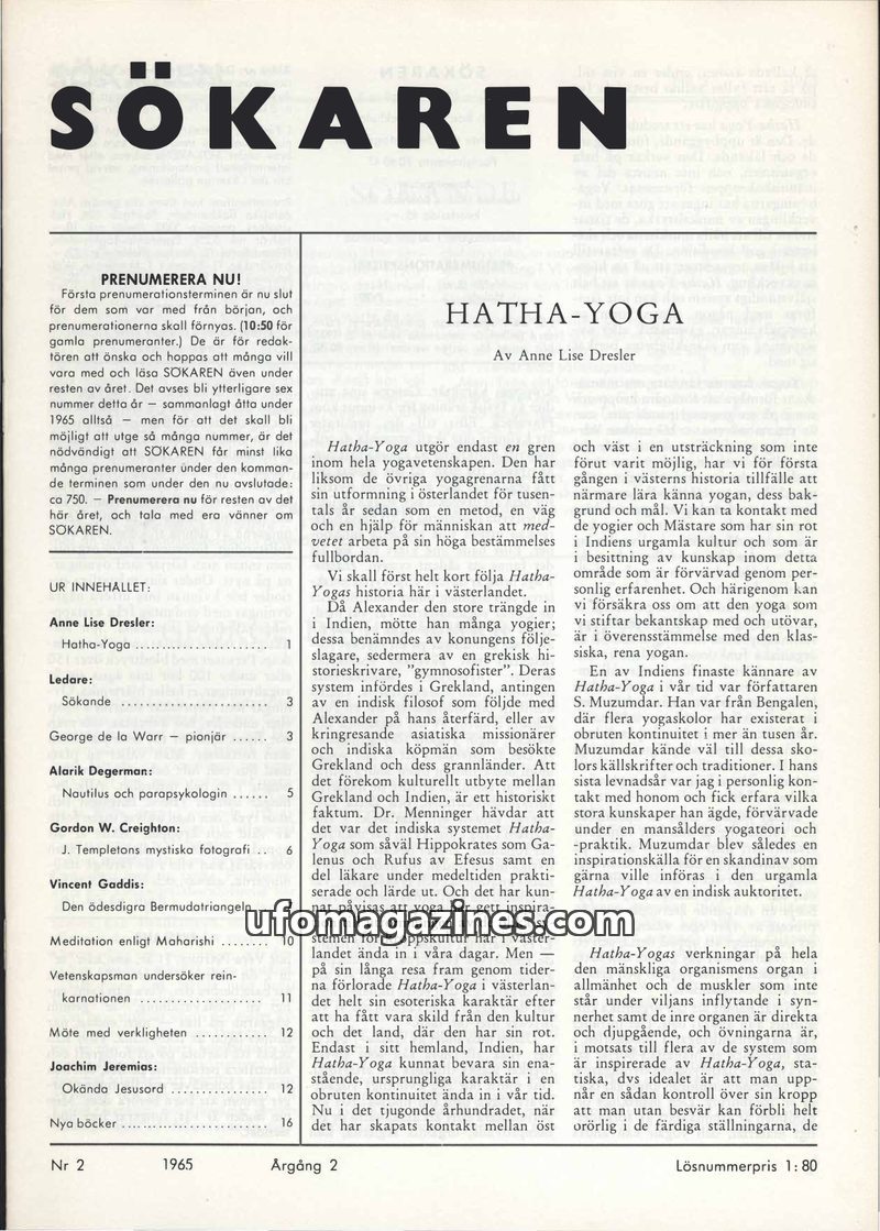 This issue of Sökaren magazine from 1965 delves into various esoteric and paranormal topics. A significant portion is dedicated to Hatha Yoga, explaining its history, principles, a