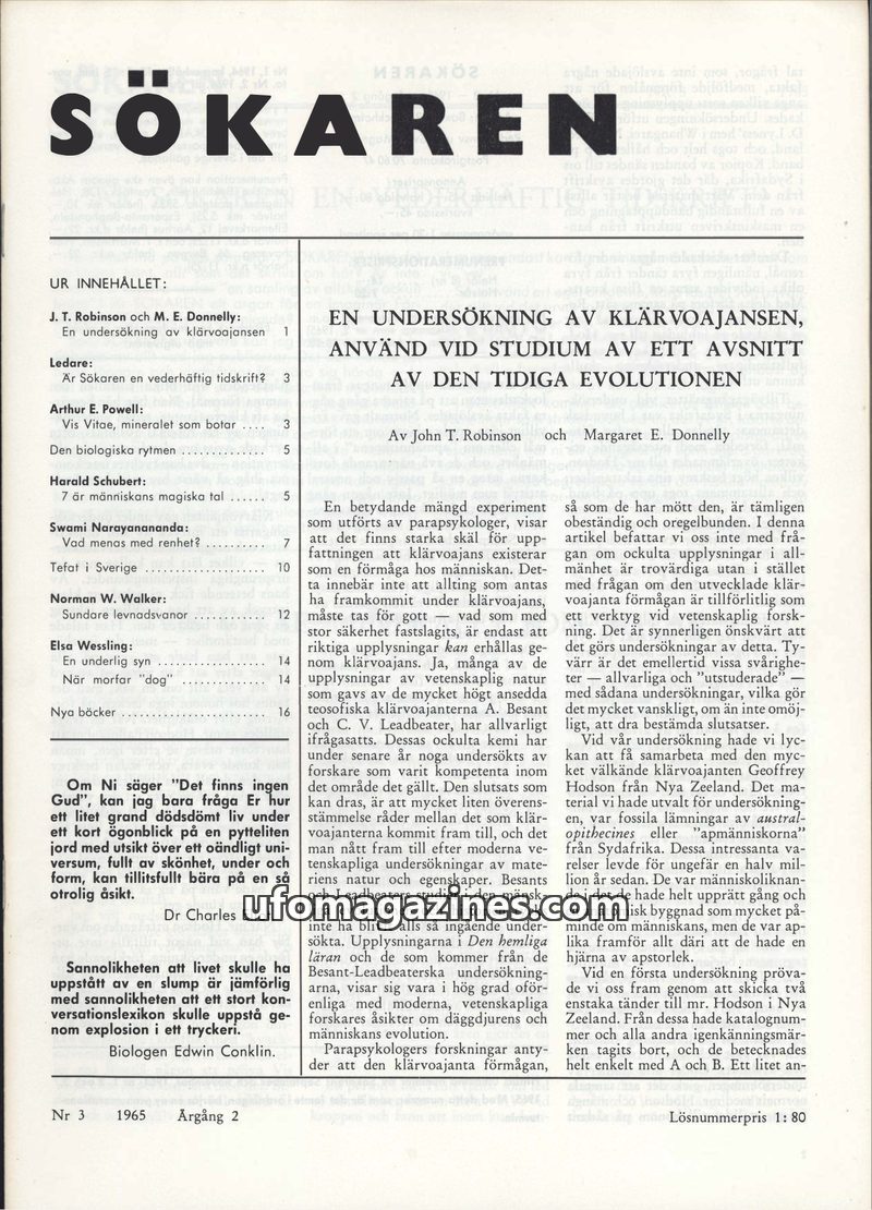 This issue of Sökaren magazine from 1965 delves into various paranormal and alternative health topics. A key article investigates clairvoyance in relation to early human evolution,