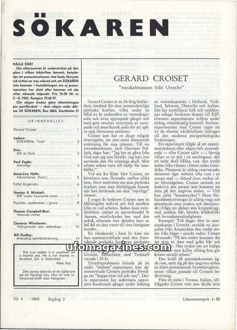This issue of Sökaren magazine delves into various paranormal and spiritual topics. It features an in-depth look at Gerard Croiset, a Dutch psychic renowned for his abilities and w