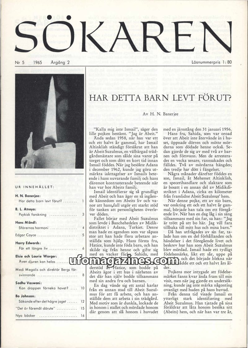 This issue of Sökaren magazine delves into various paranormal and spiritual topics. A central article details the case of Ismail Altinklish, a boy who claims to be the reincarnatio