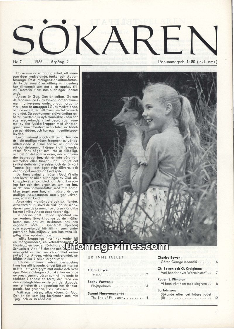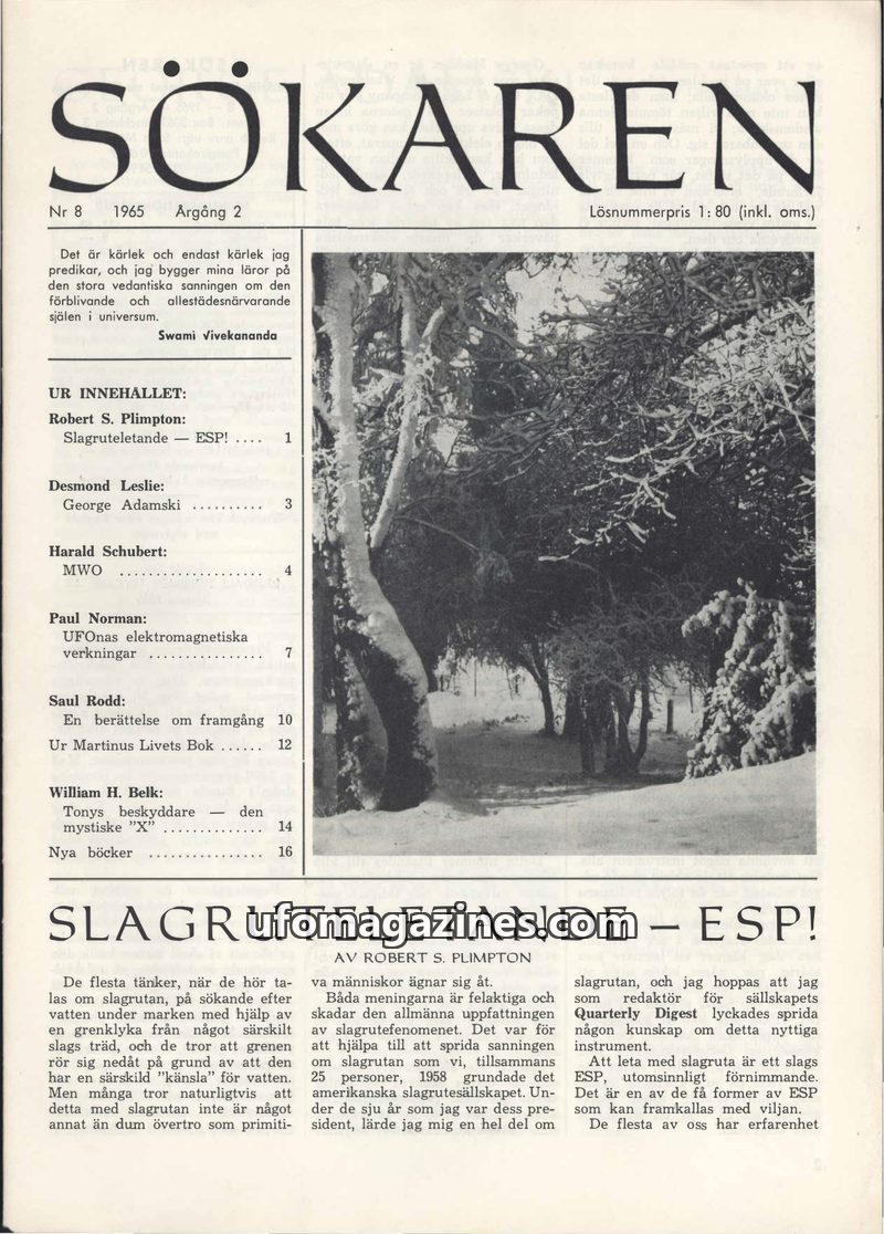 This issue of Sökaren magazine from 1965 delves into various esoteric and paranormal topics. It features an article on dowsing and ESP by Robert S. Plimpton, discussing its potenti