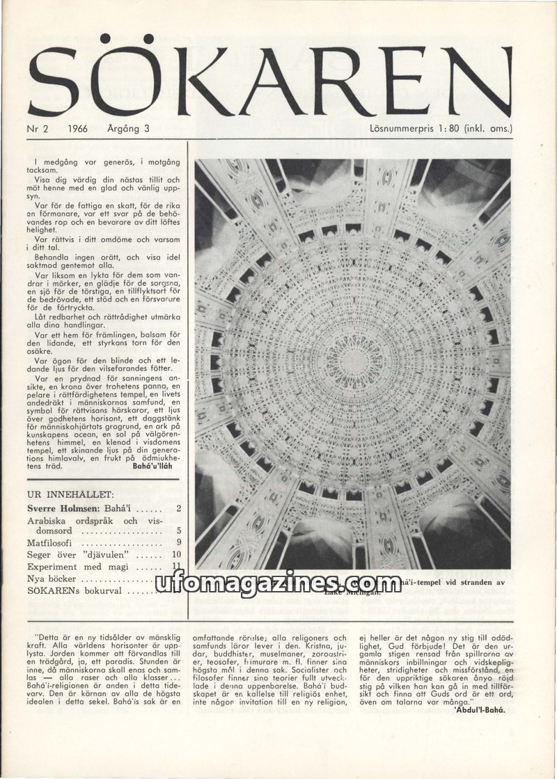 This issue of Sökaren magazine, dated 1966, focuses heavily on the Bahá'í Faith, detailing its origins, teachings, and the lives of its central figures like Bahá'u'lláh and 'Abdul'