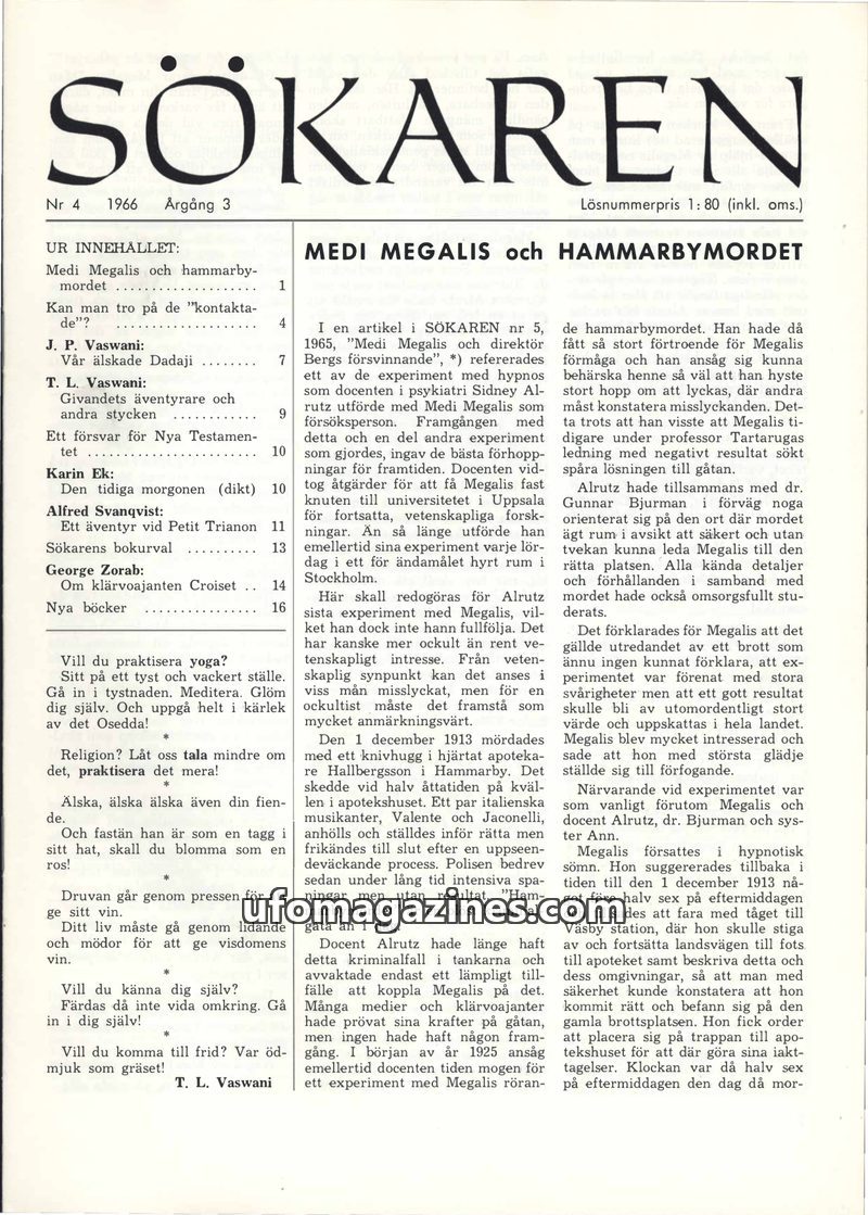 This issue of Sökaren delves into the controversial case of Medi Megalis and the unsolved Hammarby murder, detailing hypnotic experiments conducted by Dr. Sidney Alrutz. It also ex