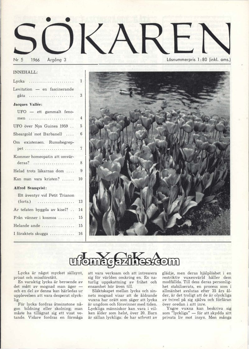 This issue of Sökaren magazine from 1966 delves into various intriguing topics. It features an article on the nature of happiness, exploring its psychological and philosophical asp