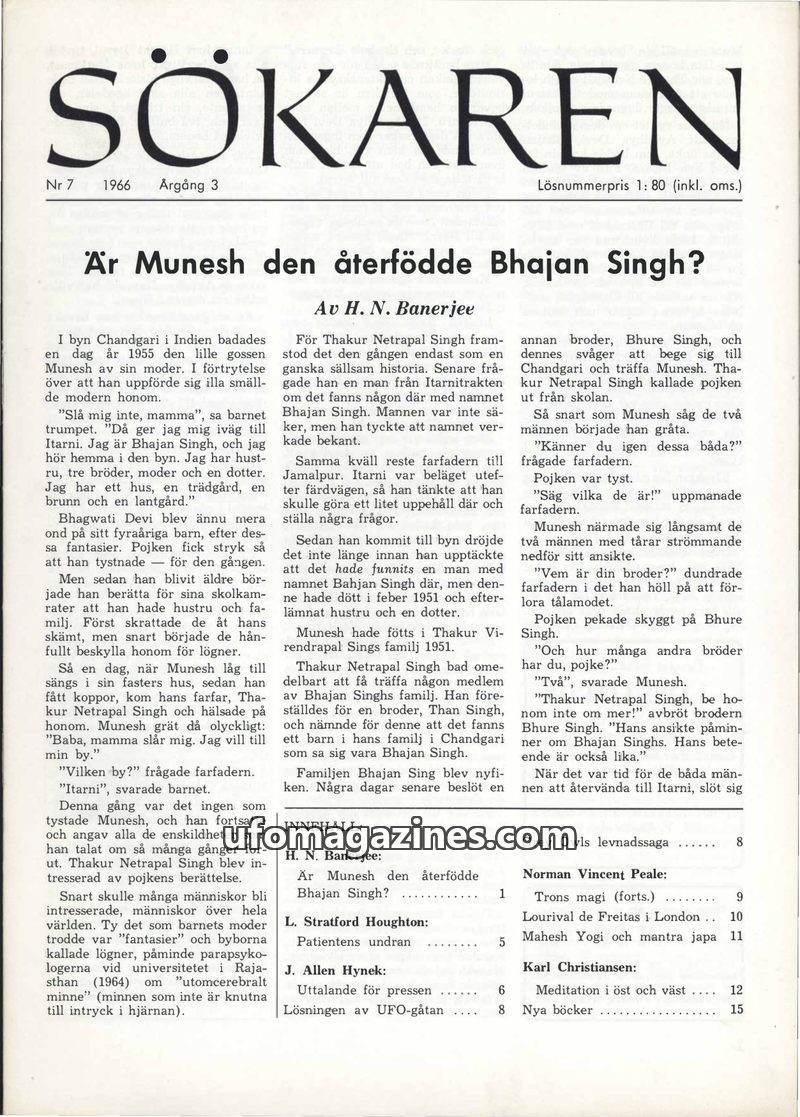 This issue of Sökaren explores the extraordinary case of Munesh, a boy in India who claimed to be the reincarnation of Bhajan Singh, providing detailed accounts of his recognition