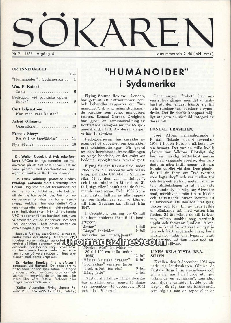 This issue of Sökaren magazine focuses on 'humanoids' in South America, detailing 16 cases compiled by Gordon Creighton from Flying Saucer Review. It also features articles on the