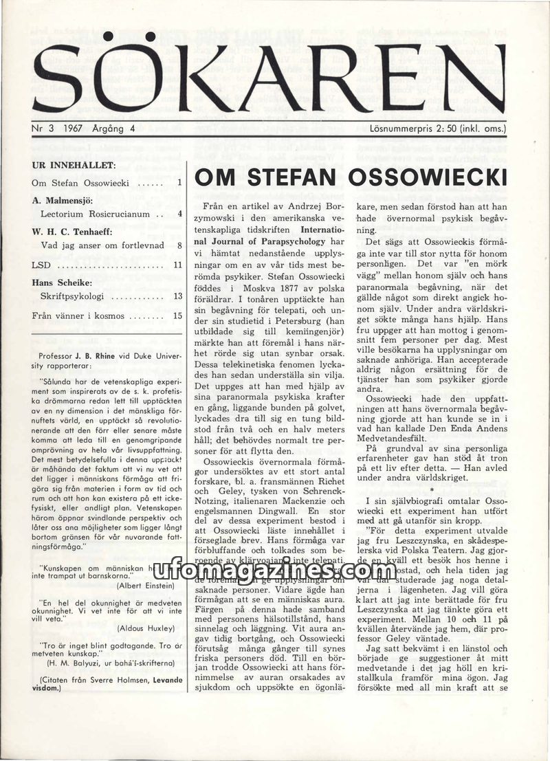 This issue of Sökaren magazine from 1967 delves into various paranormal and spiritual topics. A major feature explores the life and psychic abilities of Stefan Ossowiecki, detailin