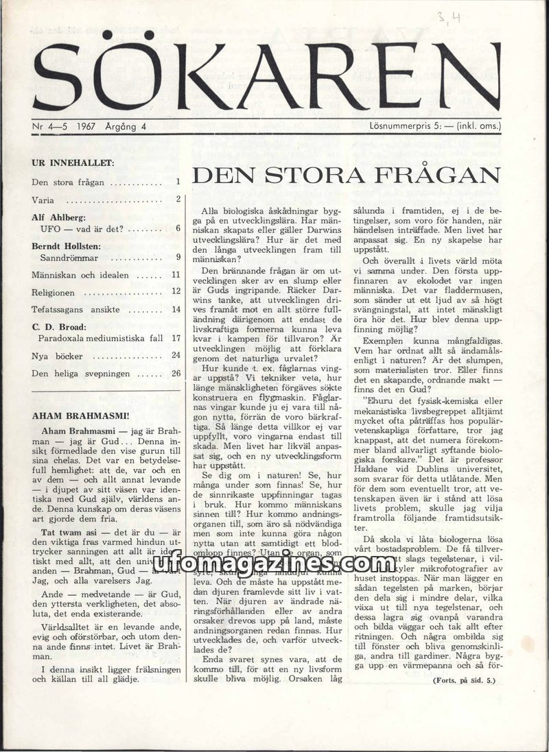 This issue of Sökaren magazine from 1967 delves into the 'Big Question' of evolution, questioning whether it's driven by chance or divine intervention. It explores UFO phenomena, w
