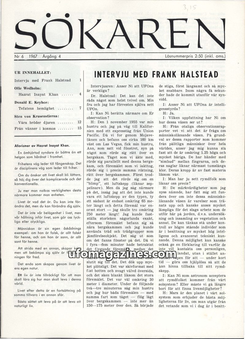 This issue of Sökaren magazine delves into various paranormal and spiritual topics. A key feature is an interview with Dr. Frank Halstead, an astronomer, who recounts his personal