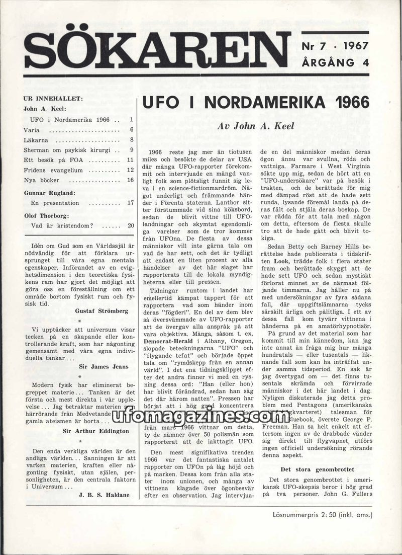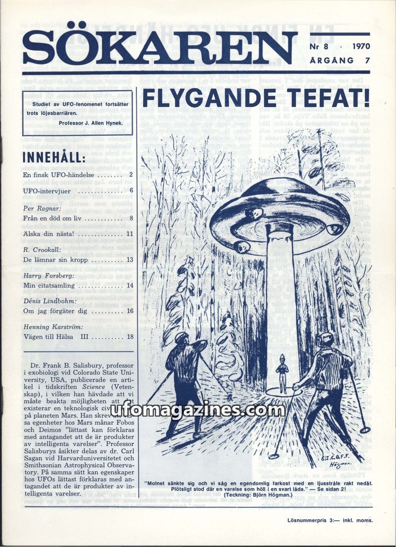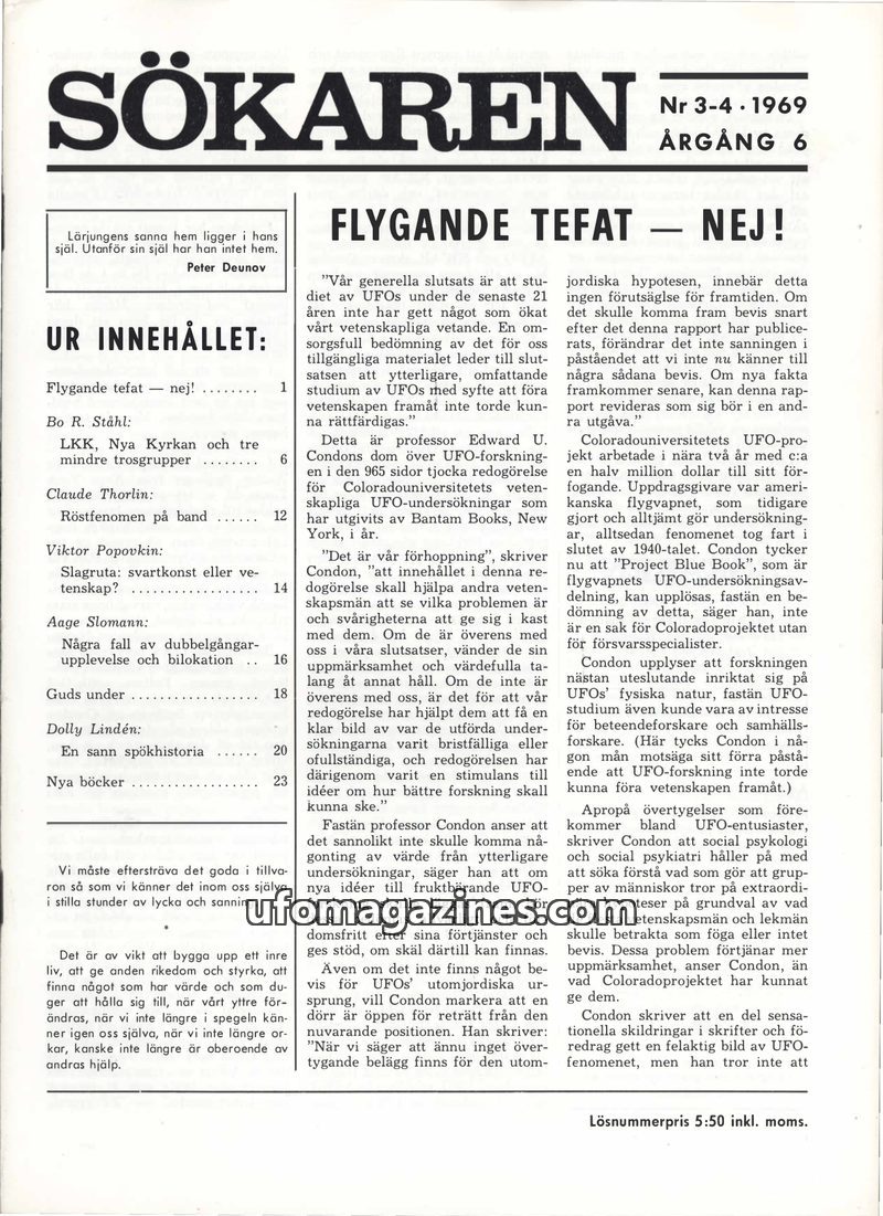 This issue of Sökaren critically examines the UFO phenomenon, presenting Professor Edward U. Condon's conclusion that UFO research has not advanced scientific knowledge and recomme