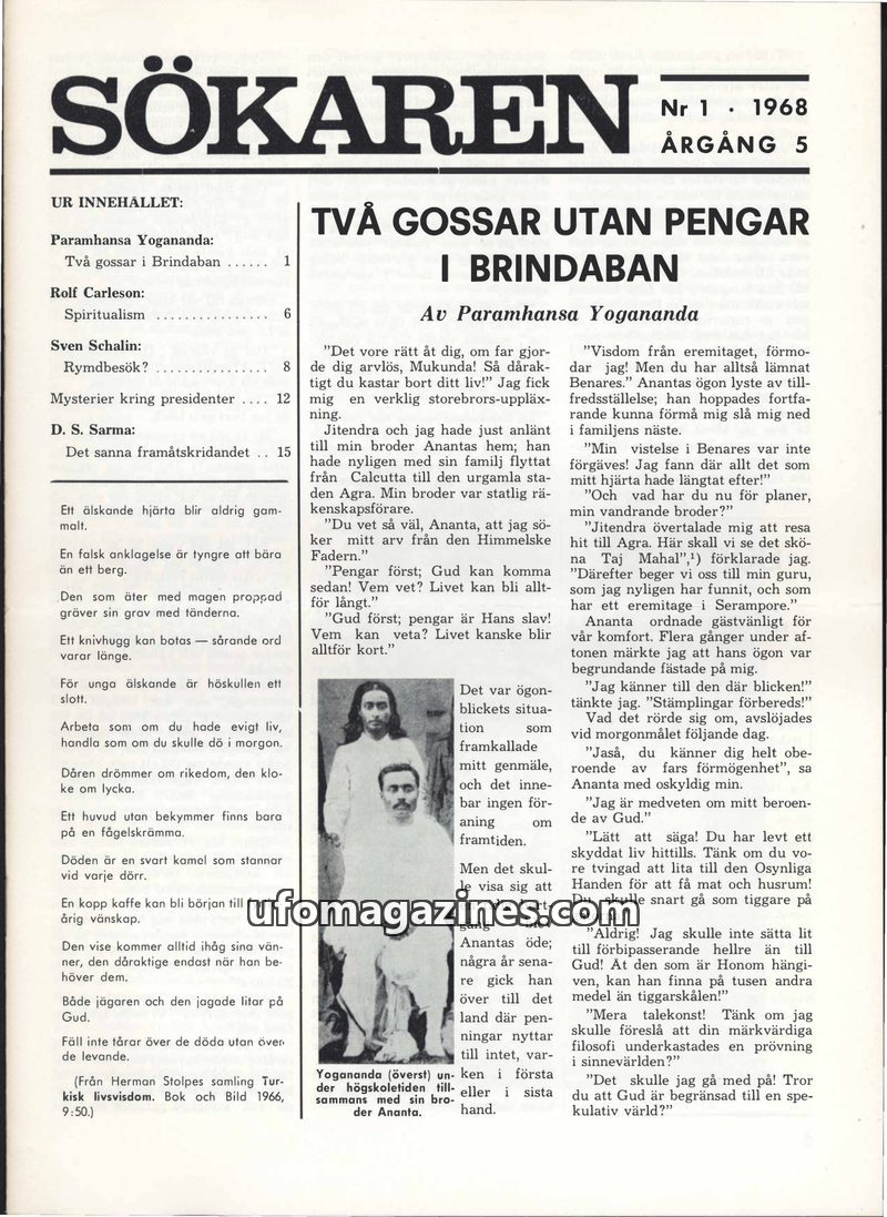 This issue of Sökaren magazine from January 1968 delves into spiritualism, UFO phenomena, and historical mysteries. A central piece is Paramhansa Yogananda's account of a spiritual