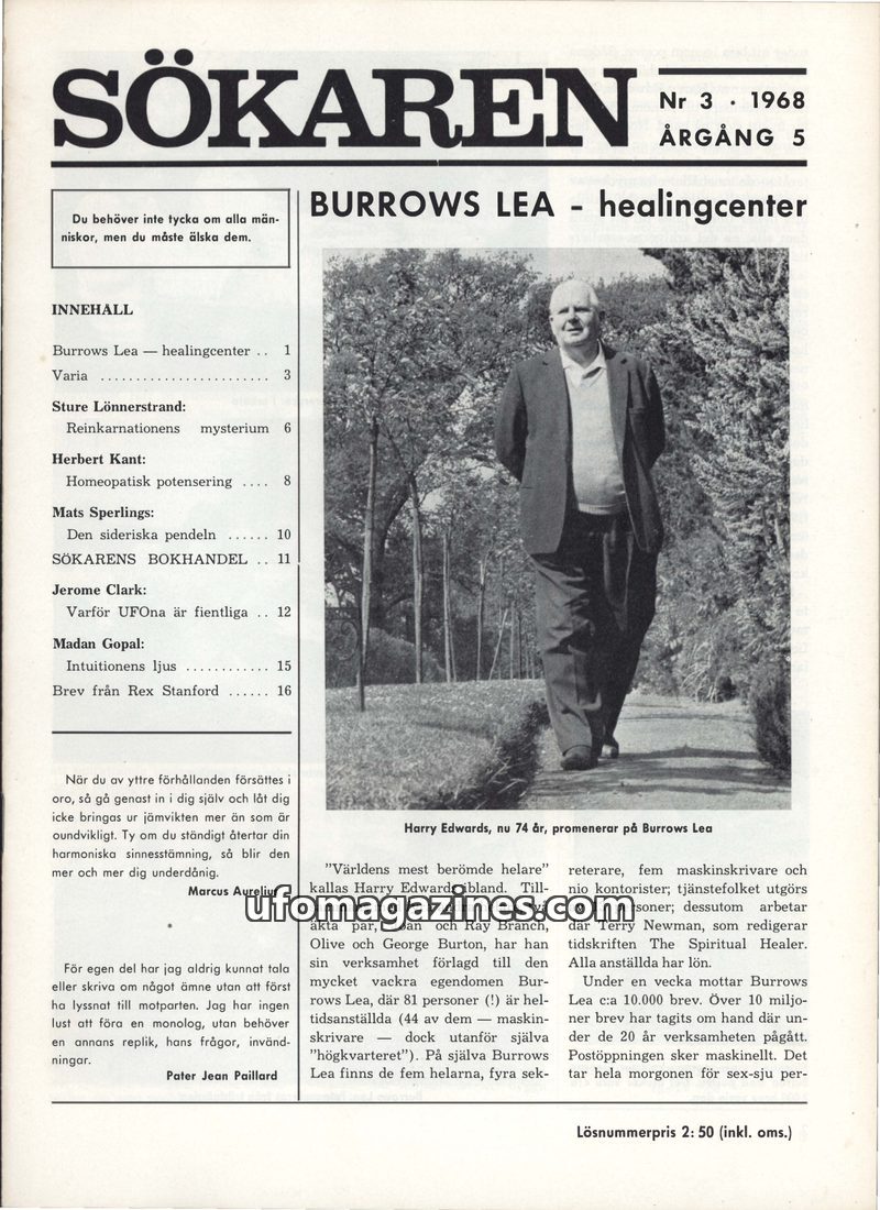 This issue of Sökaren magazine from 1968 delves into various paranormal and spiritual topics. It features an in-depth look at the Burrows Lea healing center run by Harry Edwards, w