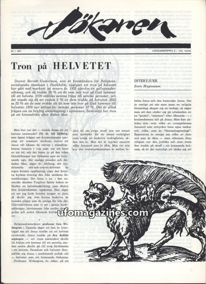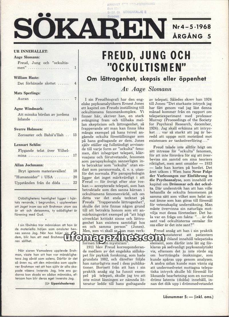 This issue of Sökaren delves into the complex relationship between psychoanalysis and occultism, examining Freud's and Jung's views. It also features reports on UFO sightings, incl