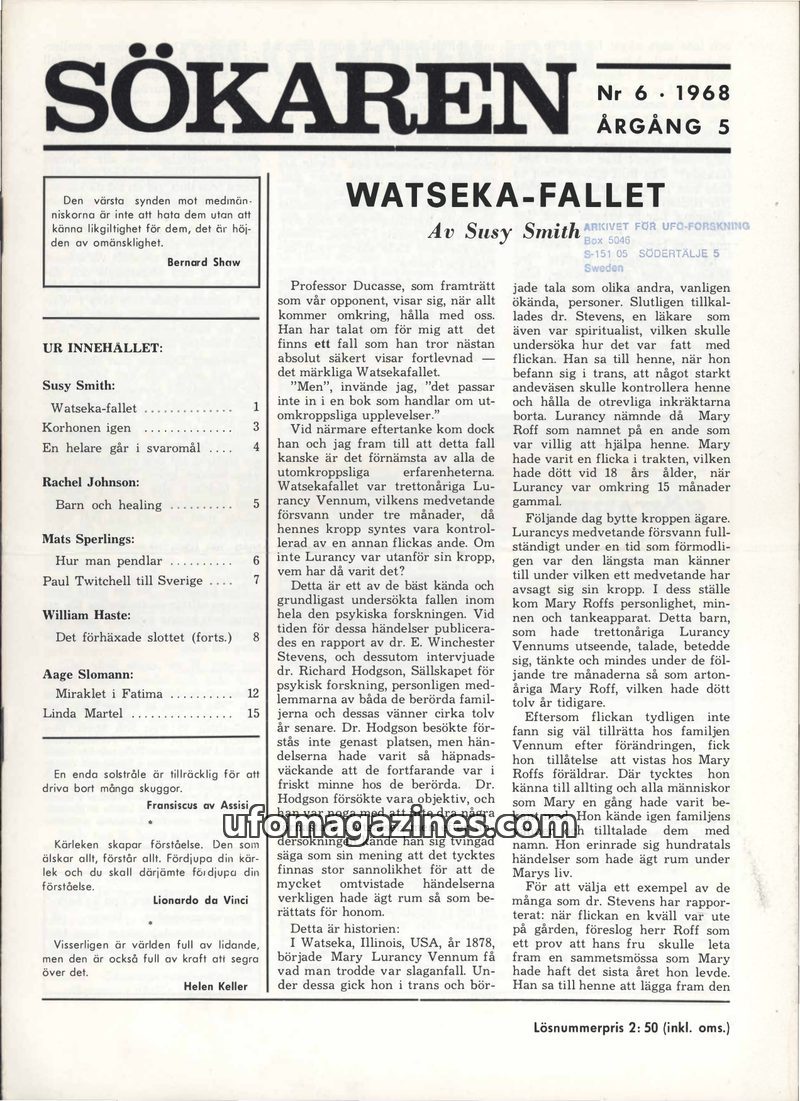 This issue of Sökaren delves into several intriguing topics. The lead article, 'Watseka-fallet' by Susy Smith, recounts the famous case of Mary Lurancy Vennum, whose body was repor