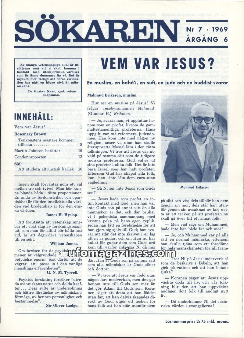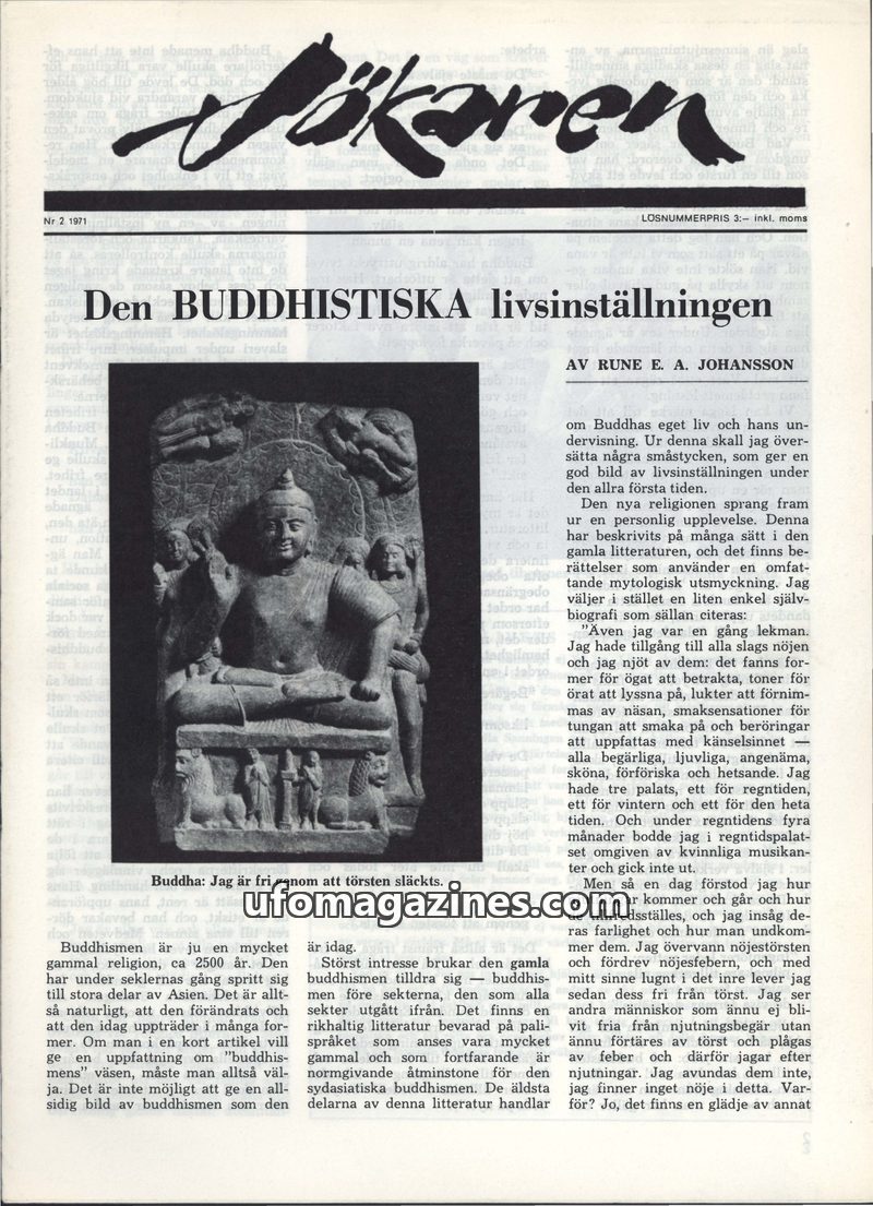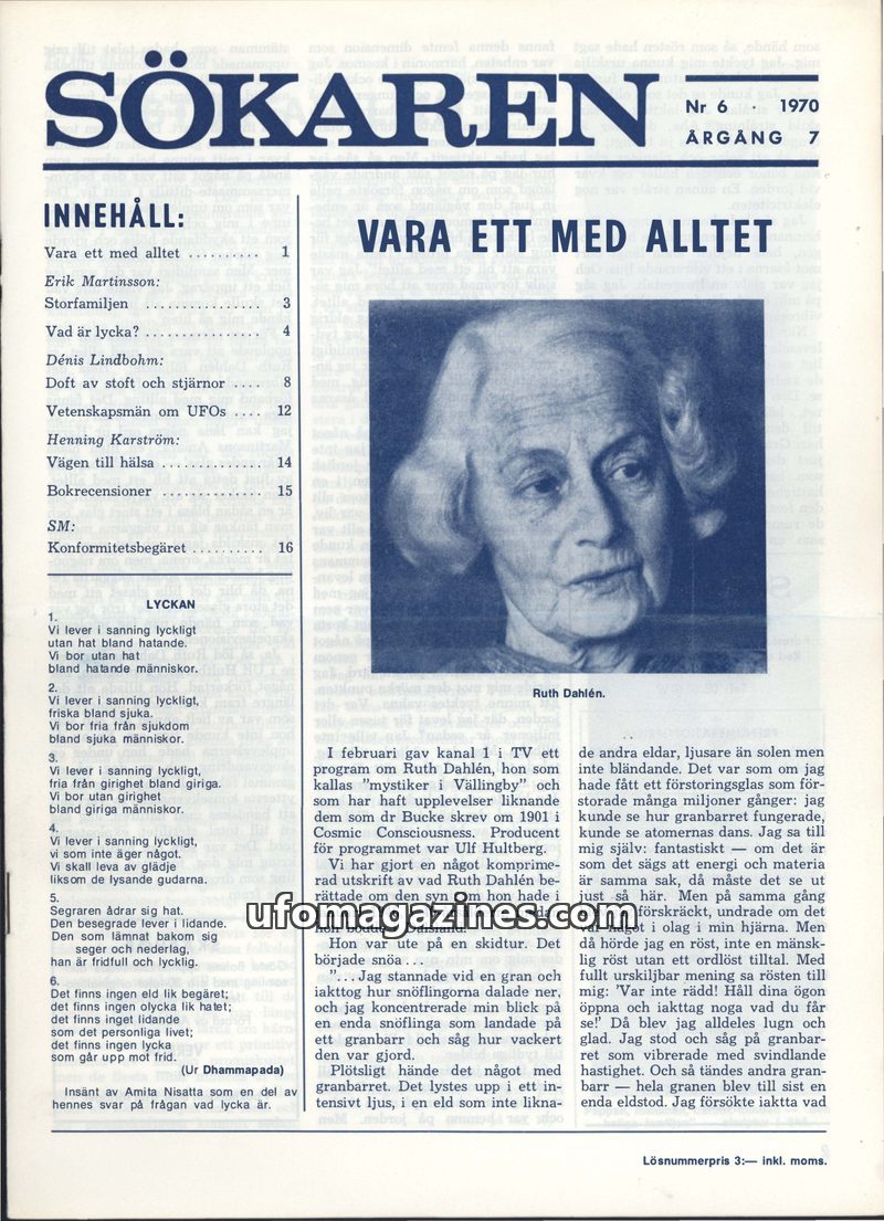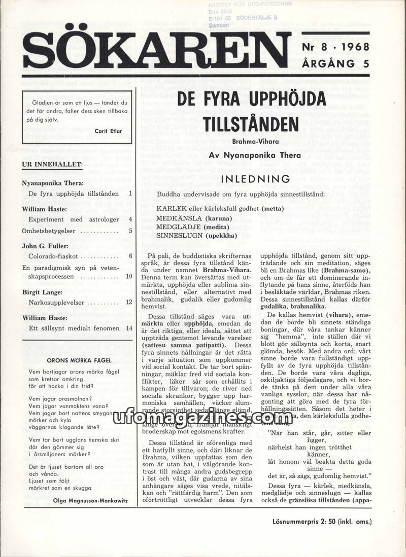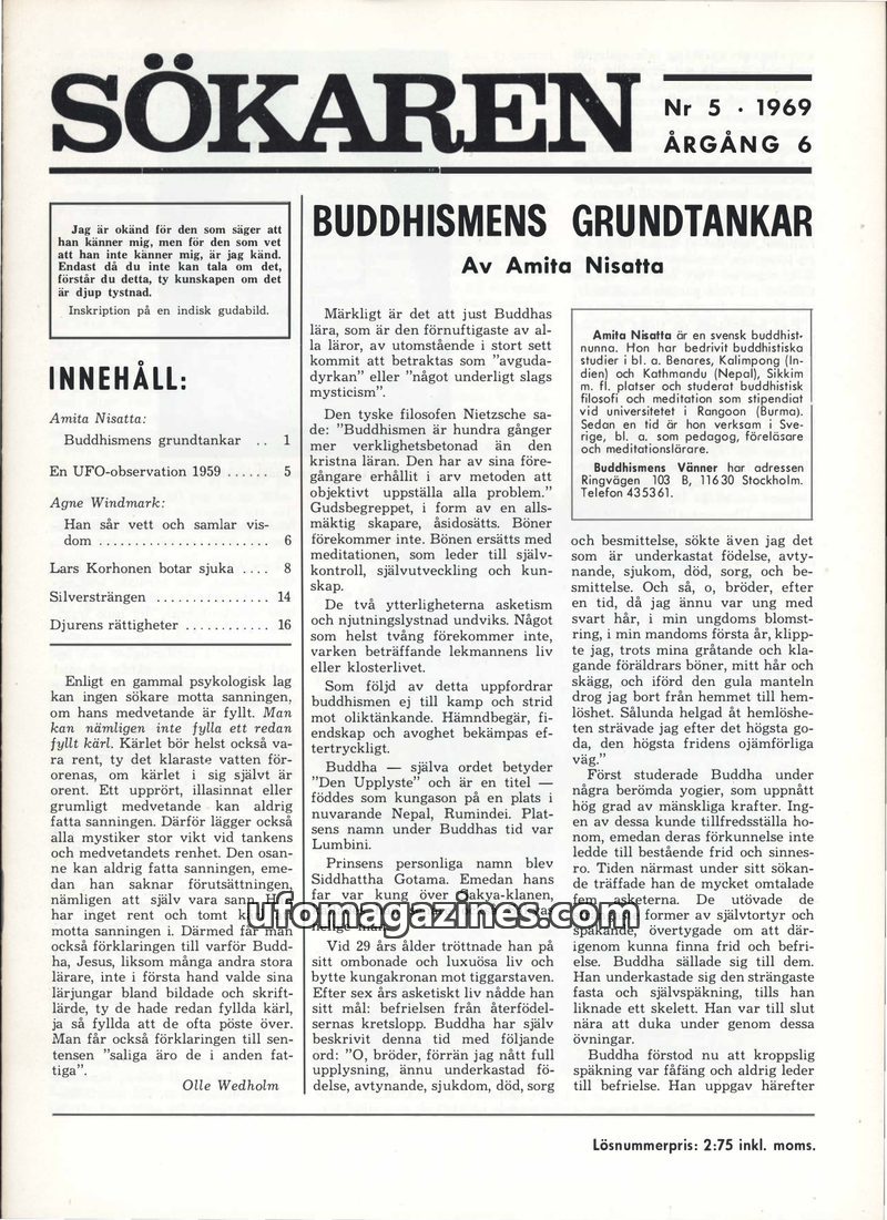 This issue of Sökaren magazine delves into various topics, including the fundamental principles of Buddhism as explained by Amita Nisatta, a detailed account of a UFO sighting in M