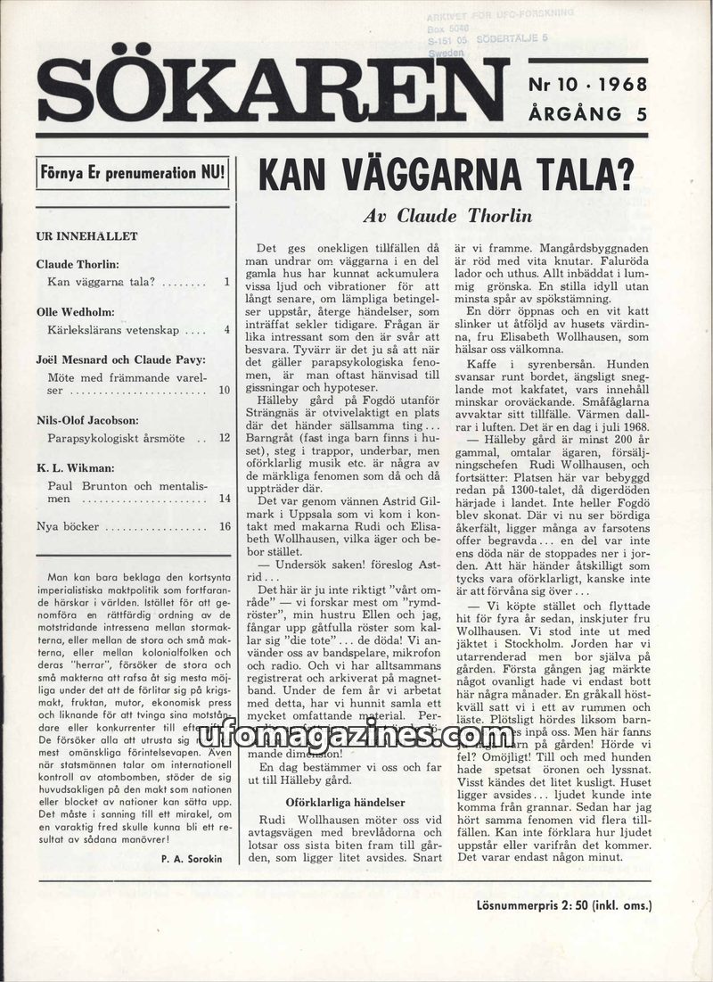 This issue of Sökaren magazine from October 1968 delves into parapsychological phenomena and UFO encounters. Articles discuss the possibility of 'talking walls' at Hälleby farm, wh