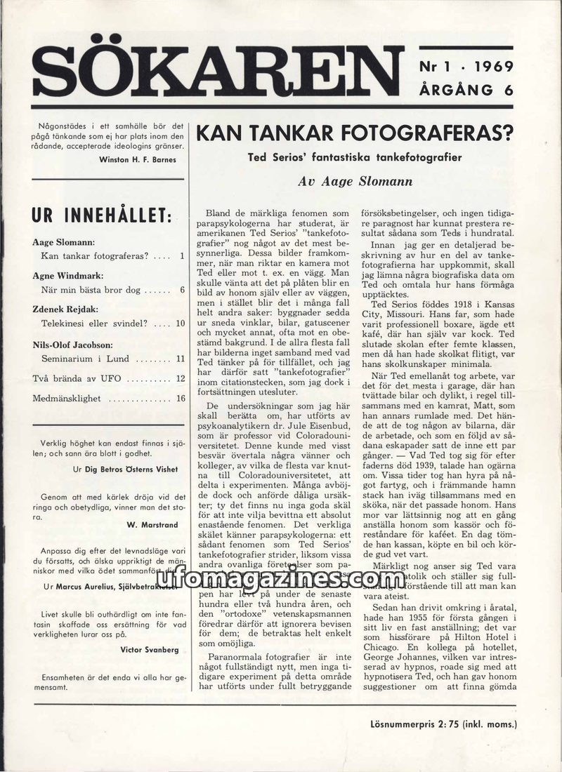 This issue of Sökaren magazine from 1969 delves into the fascinating and controversial topic of 'thought photography' as demonstrated by Ted Serios, whose images allegedly appear s
