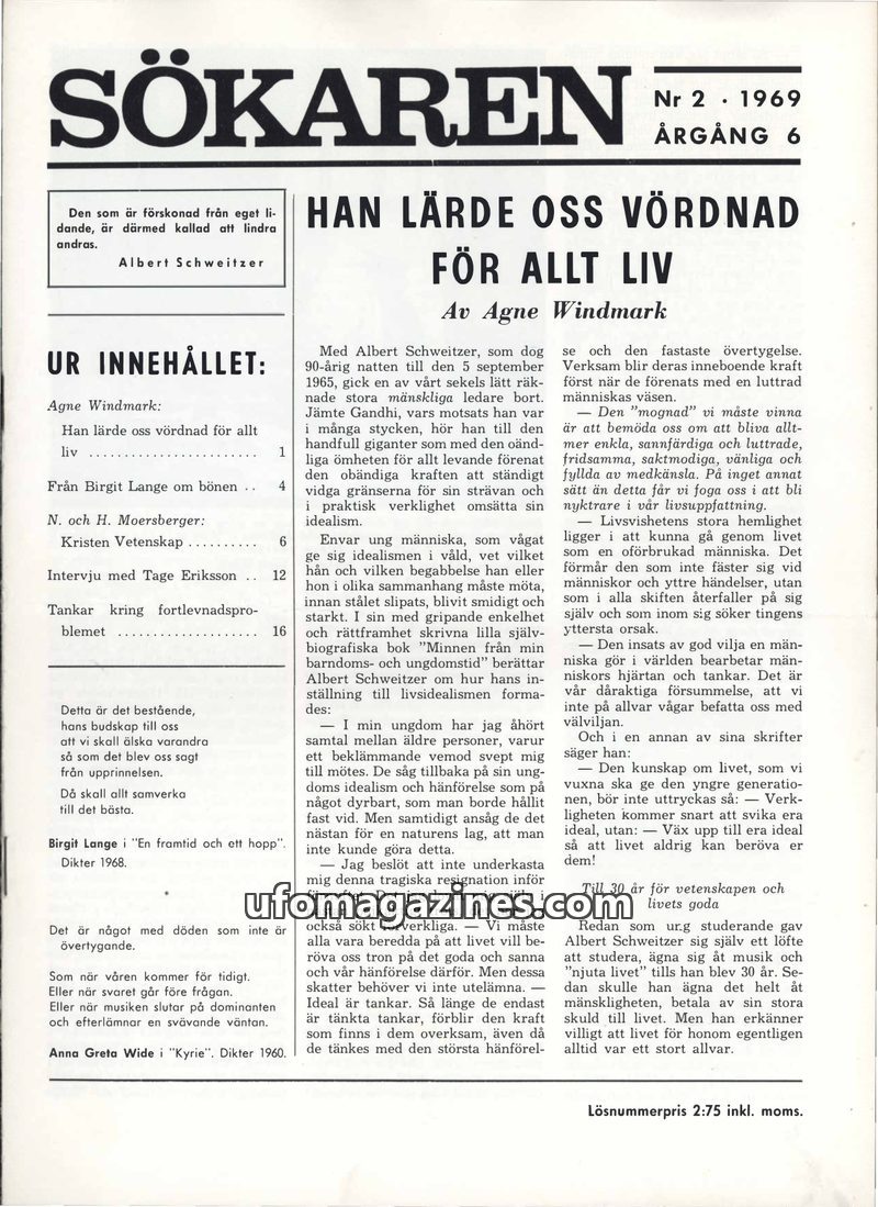 This issue of Sökaren magazine delves into various topics including the life and philosophy of Albert Schweitzer, the concept of Christian Science as founded by Mary Baker Eddy, an