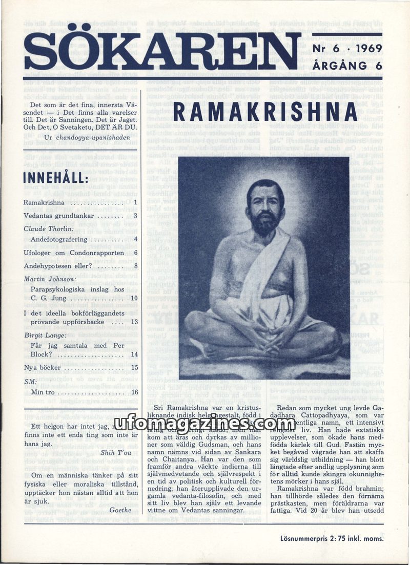 This issue of Sökaren magazine delves into the life and teachings of Sri Ramakrishna, a significant spiritual figure in India. It also explores the controversial Condon Report on U