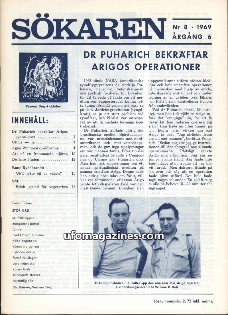 This issue of Sökaren magazine from 1969 delves into several intriguing topics. A central article details Dr. Andrija Puharich's investigation into the healing abilities of José Ar