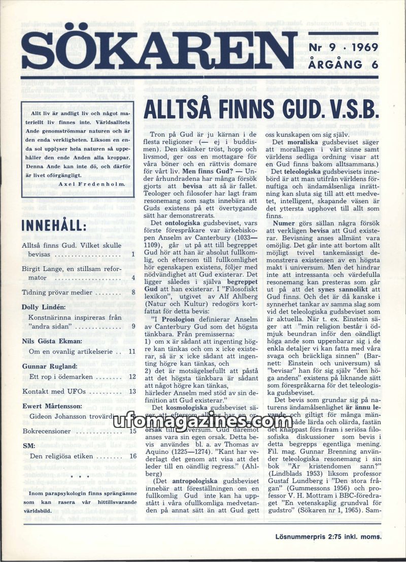 This issue of Sökaren magazine delves into philosophical arguments for God's existence, including ontological, cosmological, and teleological proofs, while also acknowledging the d