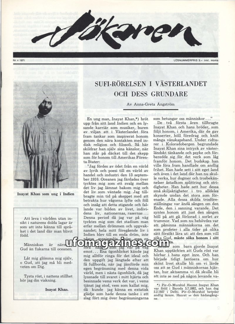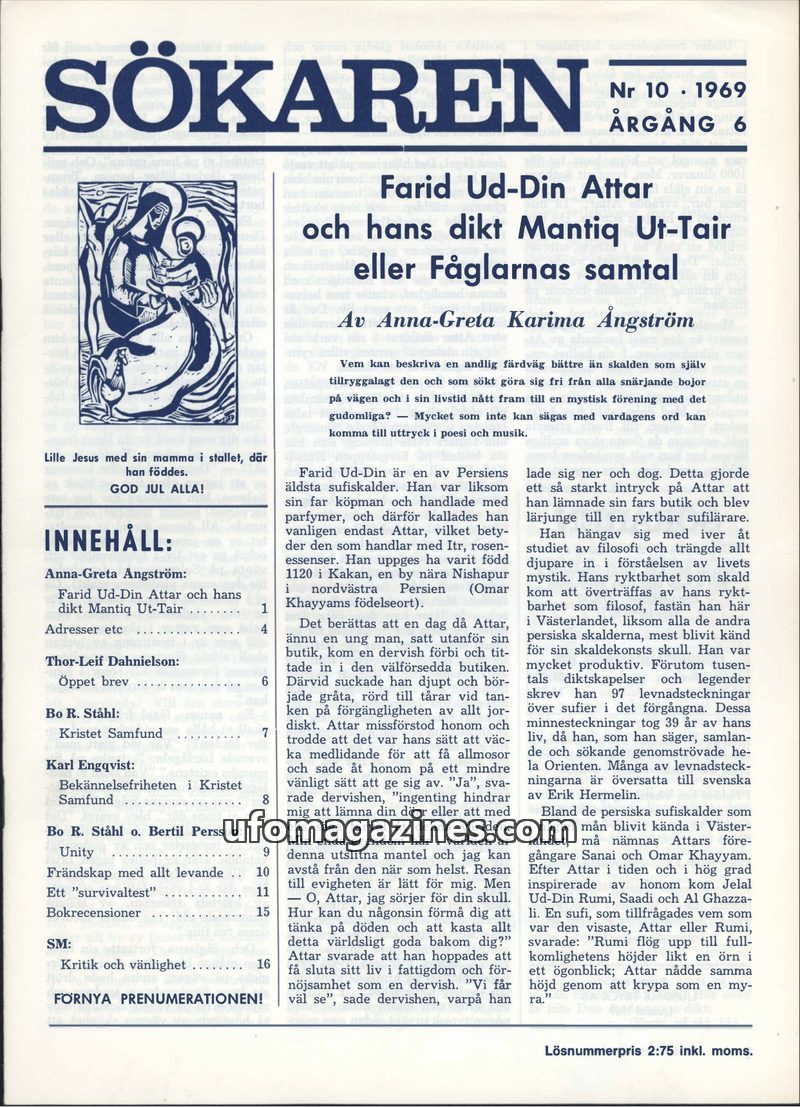 This issue of Sökaren magazine delves into the life and work of Persian sufi poet Farid Ud-Din Attar, particularly his allegorical poem 'Mantiq Ut-Tair'. It also reports on UFO sig