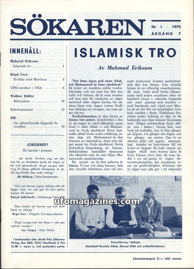 This issue of Sökaren magazine from 1970 delves into various spiritual and unexplained phenomena. A significant portion is dedicated to 'Islamisk Tro' by Mahmud Eriksson, explainin