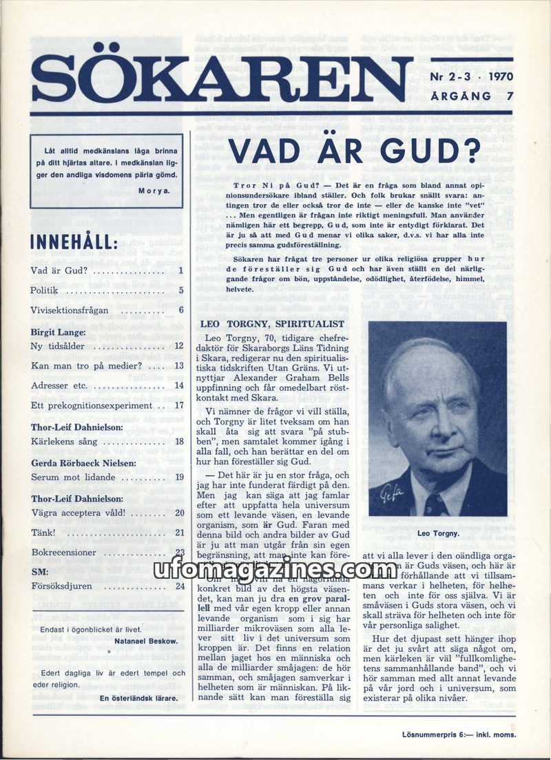 This issue of Sökaren magazine from 1970 delves into profound questions about the nature of God, featuring interviews with spiritualists and authors like Leo Torgny and Walther Eid