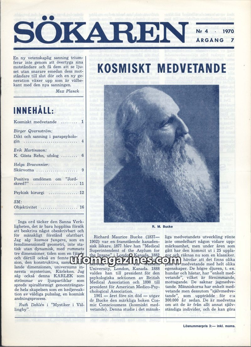 This issue of Sökaren magazine from 1970 delves into the concept of 'Cosmic Consciousness' inspired by Richard Maurice Bucke's work, exploring higher planes of consciousness. It fe
