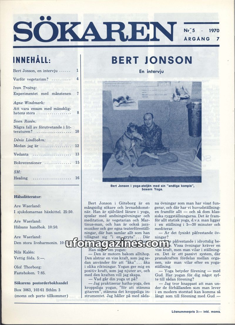 This issue of Sökaren magazine from May 1970 delves into various spiritual and health-related topics. The cover story features an interview with Bert Jonson, a versatile individual