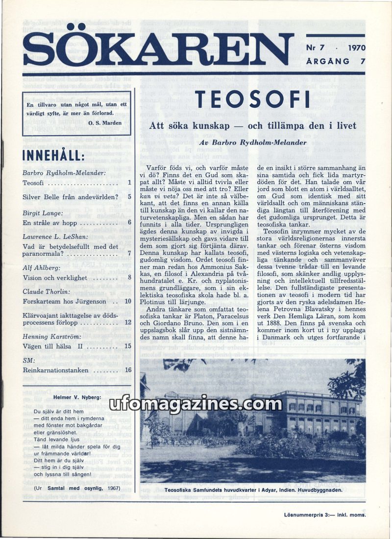 This issue of Sökaren delves into Theosophy, explaining its origins, core tenets, and the work of figures like Helena Blavatsky and N. Sri Ram. It explores the concept of reincarna