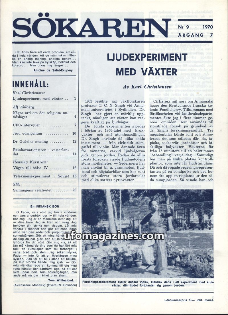 This issue of Sökaren from 1970 explores various phenomena. A key article details experiments by T. C. N. Singh showing plants react to sound waves, leading to increased crop yield