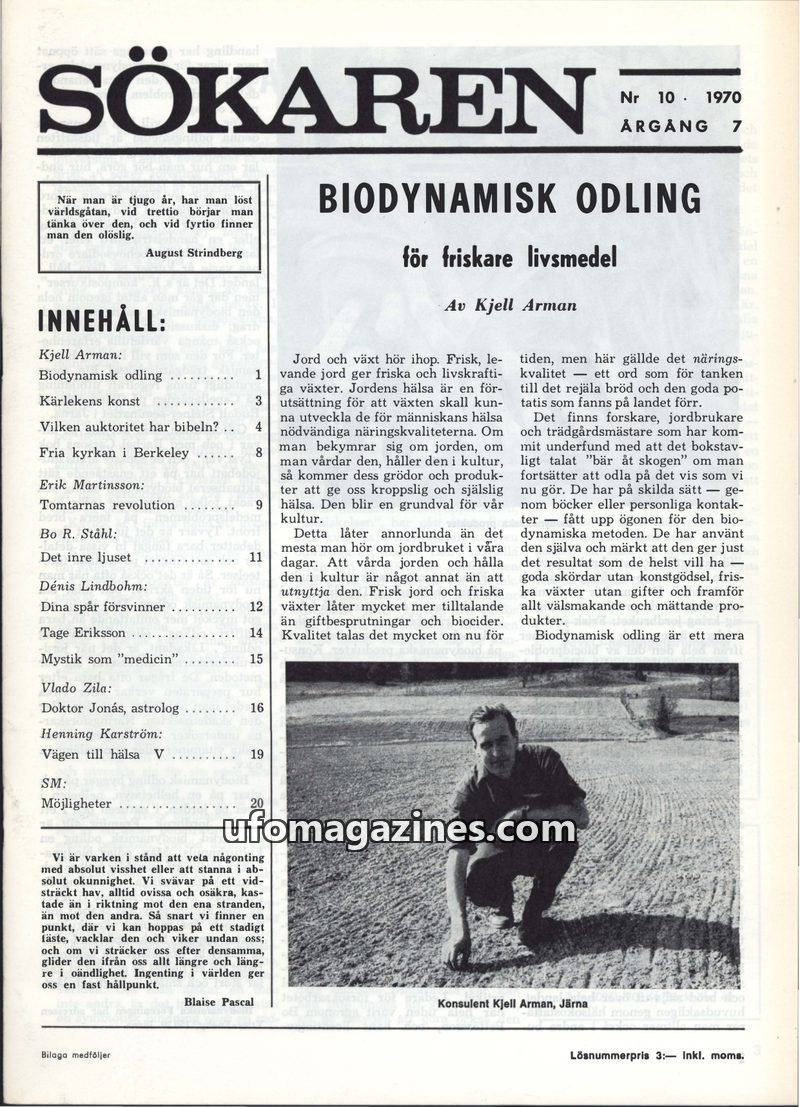 This issue of Sökaren magazine from 1970 delves into biodynamic farming, emphasizing its benefits for healthier food and a more holistic approach to agriculture. It also explores t