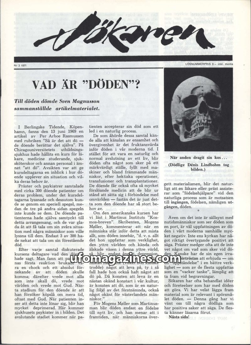 This issue of Sökaren magazine delves into various esoteric and paranormal topics. A central article by Birgit Lange explores the concept of 'Death After Death?' based on the work