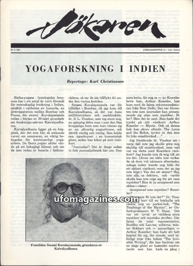 This issue of Sökaren magazine from 1971 delves into various topics including yoga research in India, the teachings of mystics, and paranormal phenomena. It features an in-depth re